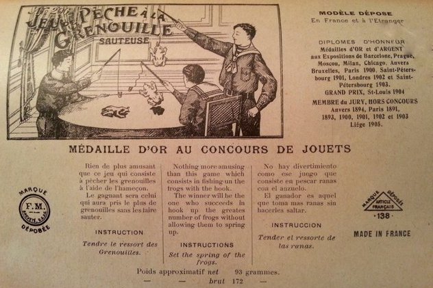 En novembre 2017, une vente de jouets a eu lieu en France à la maison de vente aux enchères Osenat Fontainebleau. Avec sept jouets de Fernand Martin, y compris un jeu rare qui est connu dans notre livre sans photo avec nombre 206 ‘Jeu de Pêche à la Grenouille Sauteuse’. Un jeu de pêche mais avec des grenouilles (voir photo), jamais vu! Plus 7 autres jouets dans l’esprit de Martin mais maintenant de Flersheim et Bonnet.